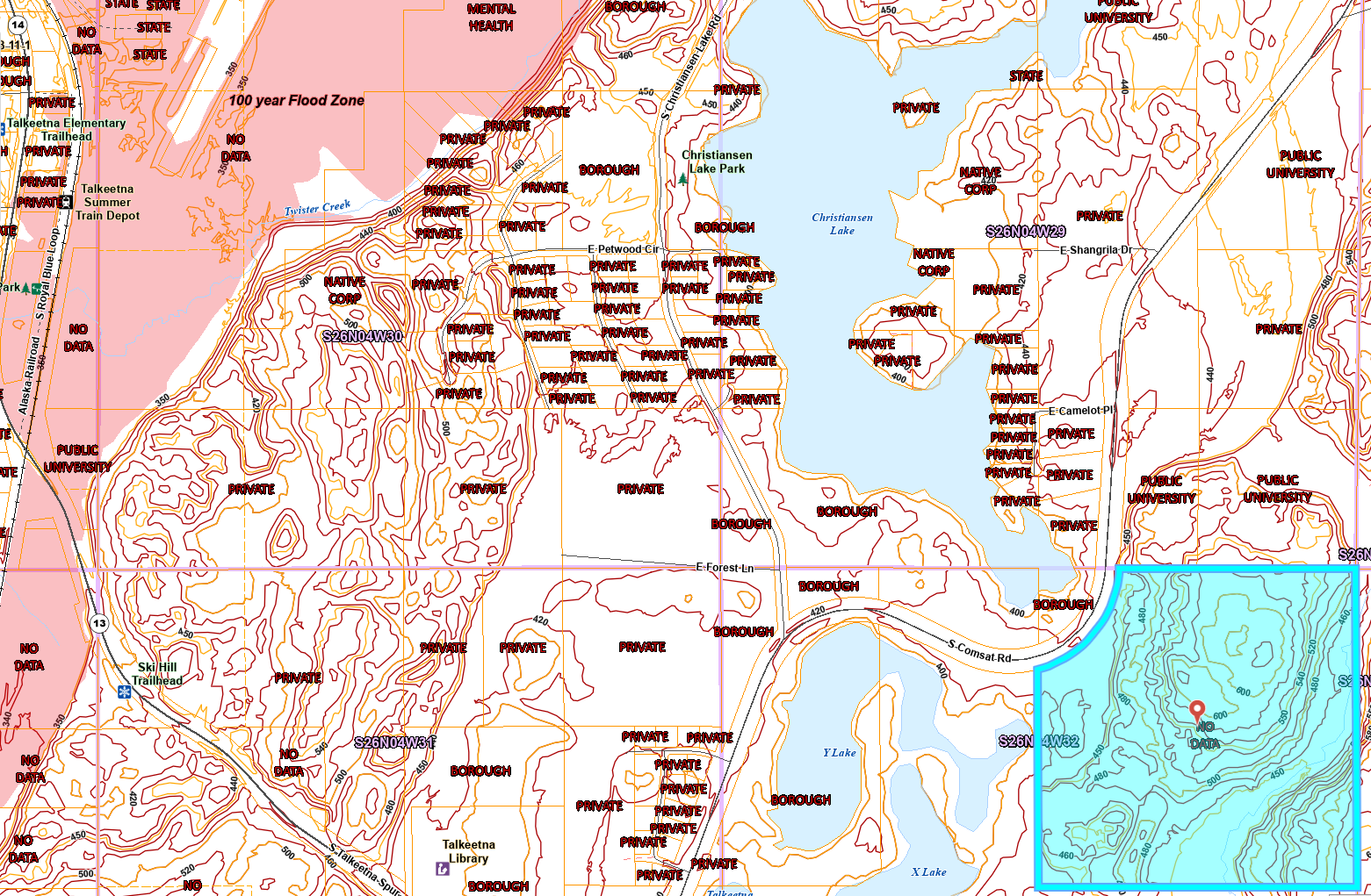 - The shocking proximity to the Talkeetna Lakes (X Y, Christiansen), which are pseudo colored in a blue shade