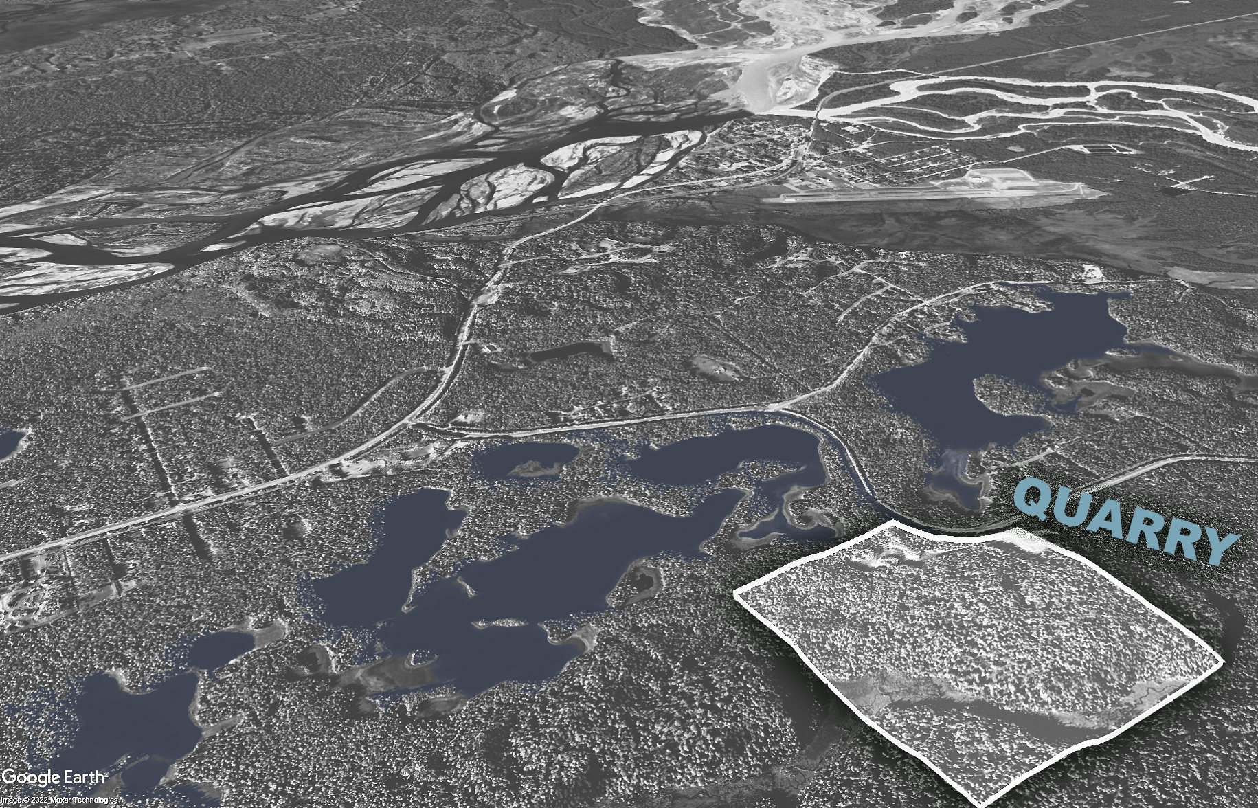 Above you can see a greyscale image of the Talkeetna area, with the proposed quarry site outlined in yellow. A few things of note you can pick out from this image